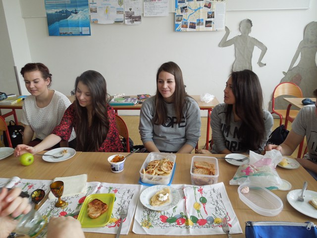 Všichni jsme připravili doma podle ruských receptů různé moučníky, cukroví, pomazánku z mrkve, tvarohové syrniky, pohankové palačinky se smetanou a s medem. Ve třídě jsme naše výtvory ochutnali a pohostili i své spolužáky ze skupiny němčiny.