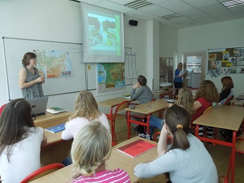 V pondělí 16.června 2014 jsme v hodině ruštiny v 1. ročníku přivítali paní Olgu Dvořákovou, která se narodila v Petrohradě a žila v Rusku do 23 let, kdy se spolu se svým českým manželem přestěhovala do Čech. Připravila si pro nás prezentaci o ruské základní a střední škole, přinesla nám ukázat své školní sešity i maturitní vysvědčení, plné čtyřek a pětek, což však jsou v Rusku vlastně jedničky a dvojky. Zaujalo nás také, že na VŠ tam studují zdarma jen studenti, kteří měli nejlepší výsledky u přijímacích zkoušek, ostatní za studium platí.